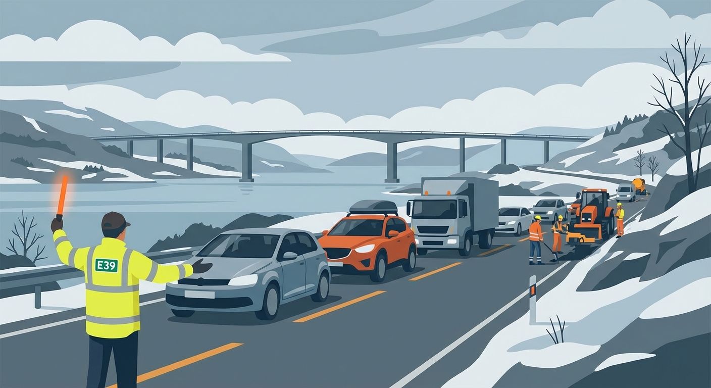 Frå 8. til 9. januar vil trafikantar på E39 mellom Nordhordlandsbrua og Eido møte manuell dirigering på dagtid. Arbeidet er bevegelig og gjeld ikkje heile strekninga samtidig.